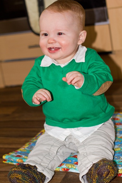 Asher will be 8 months old on Tuesday! He’s a proper little man now, with two more teeth to balance out the smile a bit. He gets more mobile every day… earlier today he scooted all the way across the living room to the doorway just so he could peek through the hall to the kitchen to see what mom and dad were up to. He’s eating real people food now, three meals a day. Today for lunch he had beef stew (pureed of course)! Our freezer is stuffed to the max full of frozen cubes of baby food… he loves pears, sweet potatoes, swede, and butternut squash. He even seems to like zucchini and green beans. Yogurt and plums are his new favorite foods. The down side is that our freezer is so full of baby food we don’t have any room for ice cream! Oh the humanity!
